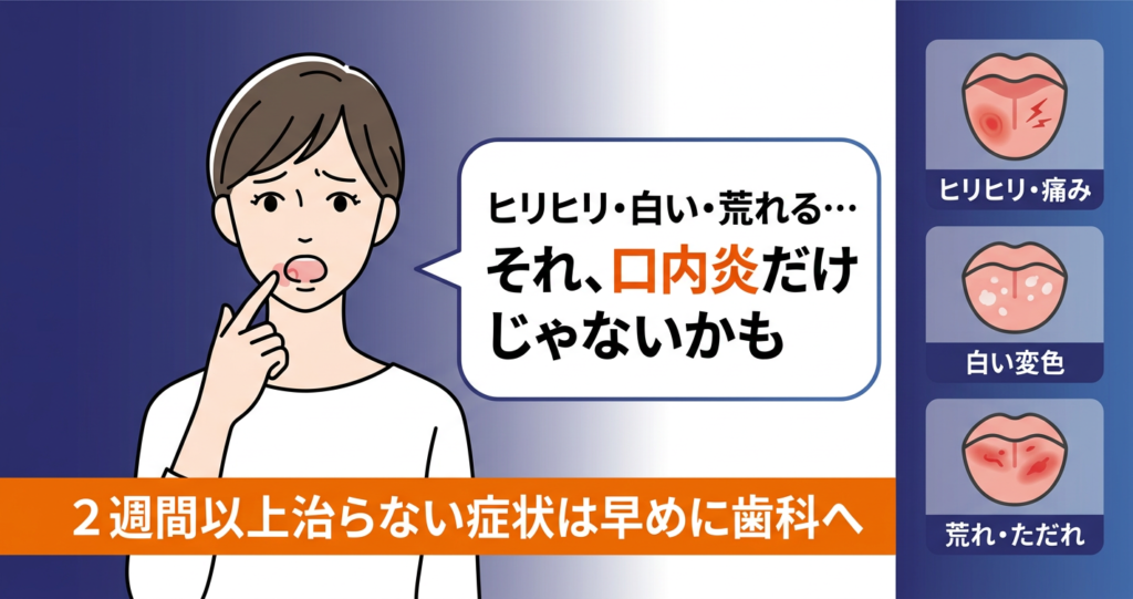 そのほか、熱い飲食物によるやけどや、合わない義歯・被せ物がこすれることで粘膜が傷つく物理的な刺激も原因として挙げられます。やけどや摩擦による荒れは原因を取り除けば比較的早く落ち着く傾向がありますが、同じ場所に刺激が繰り返しかかると慢性化しやすくなるため、歯科で調整してもらうことが大切です。